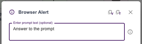If the browser dialog is a **prompt** requiring input, enter the response text as shown in the screenshot below. This field is ignored for browser dialogs of type alert, confirm or beforeunload (page exit).