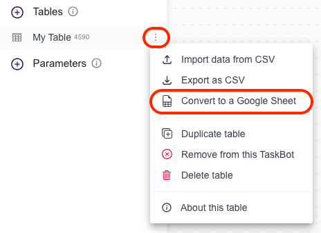 **This action is not reversible**. Once your table converts to a Google Sheet, you cannot convert it back to a native table.