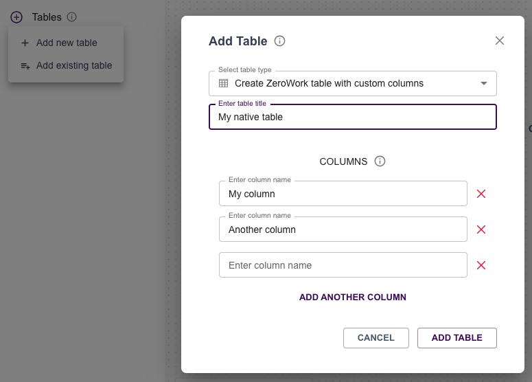 Below is an example of how to create a native table. You will be able to edit columns or create new columns after table creation, too.